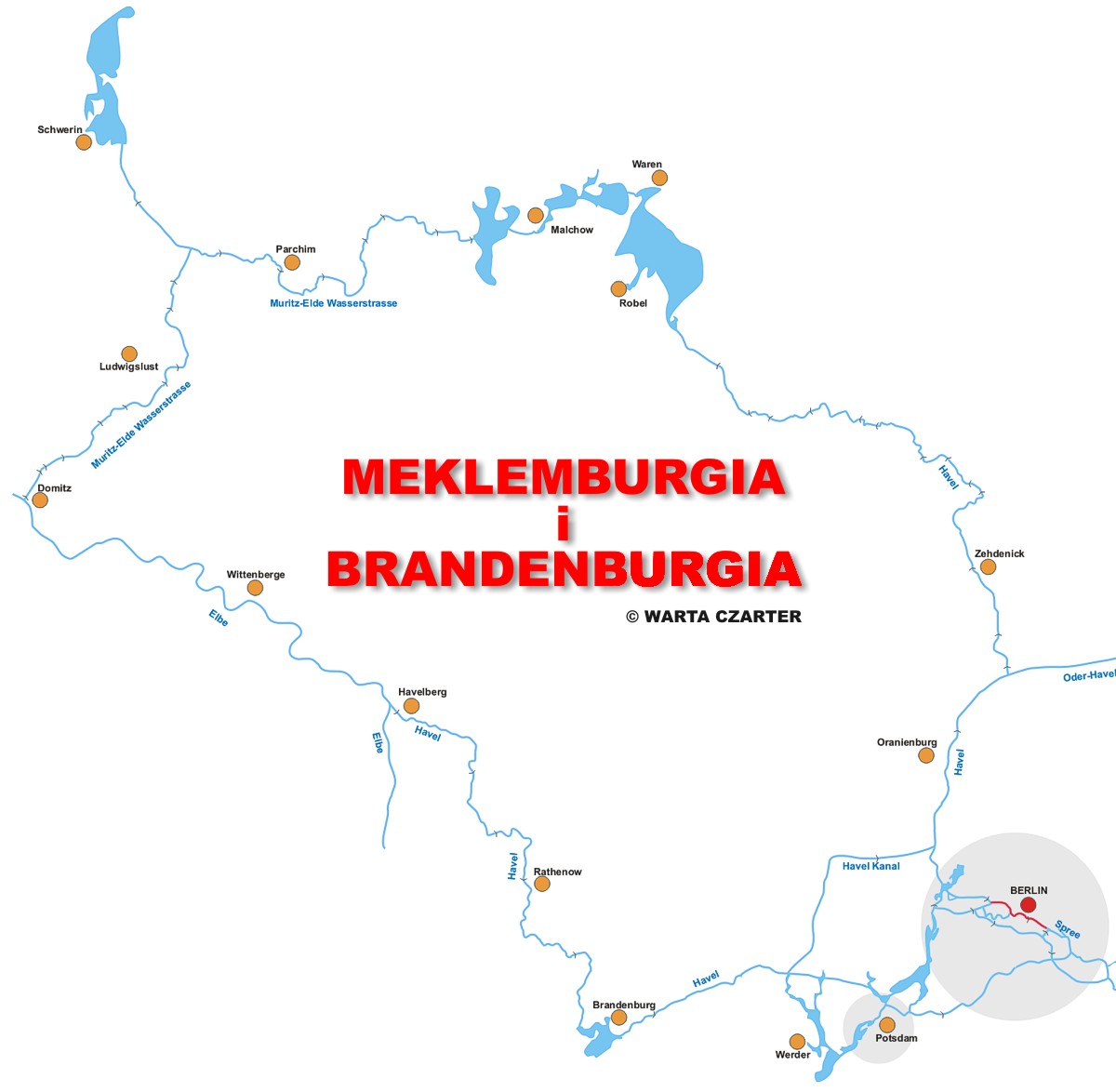 W czasie wakacji w roku 2026 proponujemy przepłyniecie pętli po Meklemburgii i Brandenburgii. Rejs bardzo ciekawy turystycznie, a ponad połowa trasy prowadzi kanałami typowo turystycznymi, gdzie nie ma żeglugi zawodowej. Wiemy o czym piszemy, bo już tam byliśmy w roku 2015.